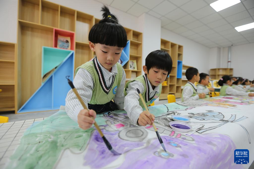 9月28日,甘肅省定西市安定區(qū)幼兒園的小朋友在繪制《我愛(ài)你中國(guó)》長(zhǎng)卷。