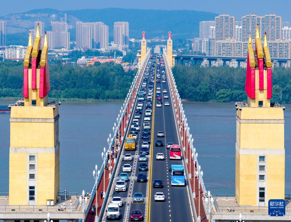 10月8日,車輛行駛在南京長江大橋上(無人機(jī)照片)。