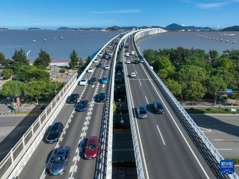 10月7日,在浙江省舟山市普陀區(qū),車輛行駛在朱家尖海峽大橋上(無人機(jī)照片)。